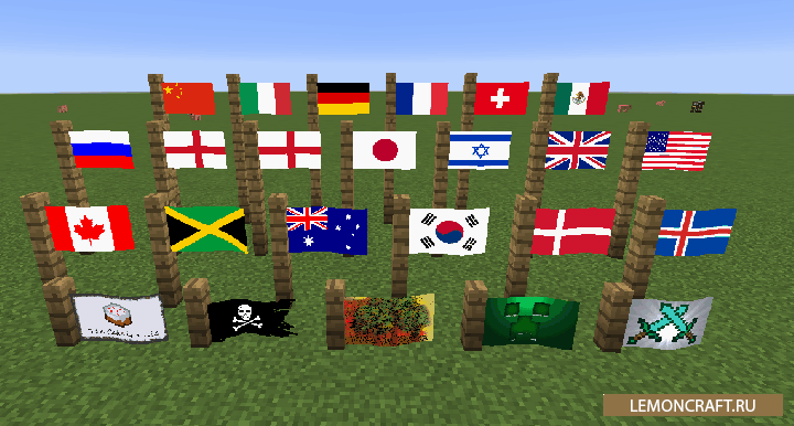 Модификация добавит в майнкрафт набор развевающихся на ветру флагов, которые смогут обозначит принадлежность построек к той или иной стране.